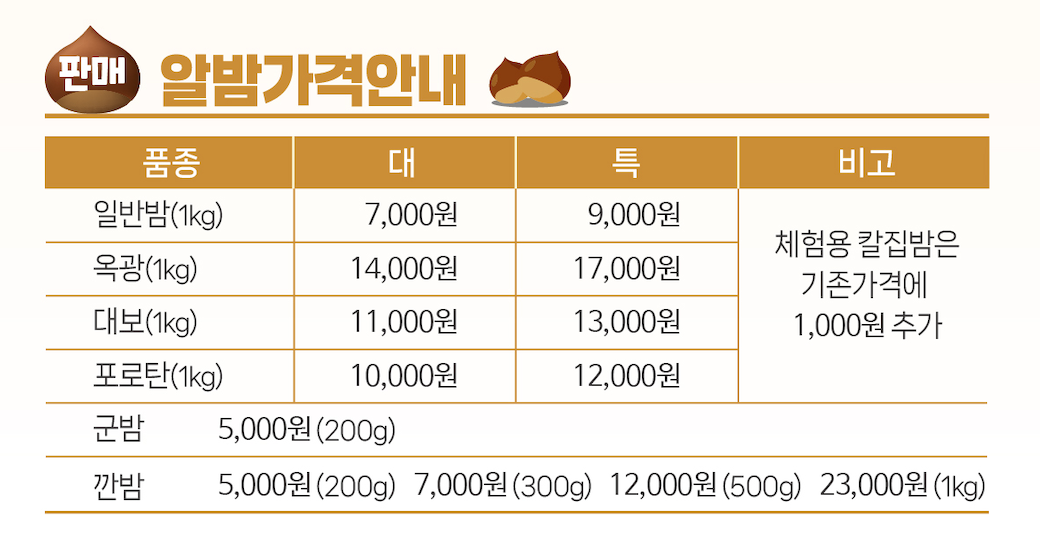 차령산맥 및 계룡산 계곡의 오염되지 않은 청정한 공기와 물, 토양 그리고 산지의 심한 일교차가 질 좋은 고품질의 알밤이 생산되며, 밤을 강제로 떨어트려 수확하지 않고 자연적으로 떨어지는 알밤을 수확하여 맛과 저장력이 뛰어납니다.